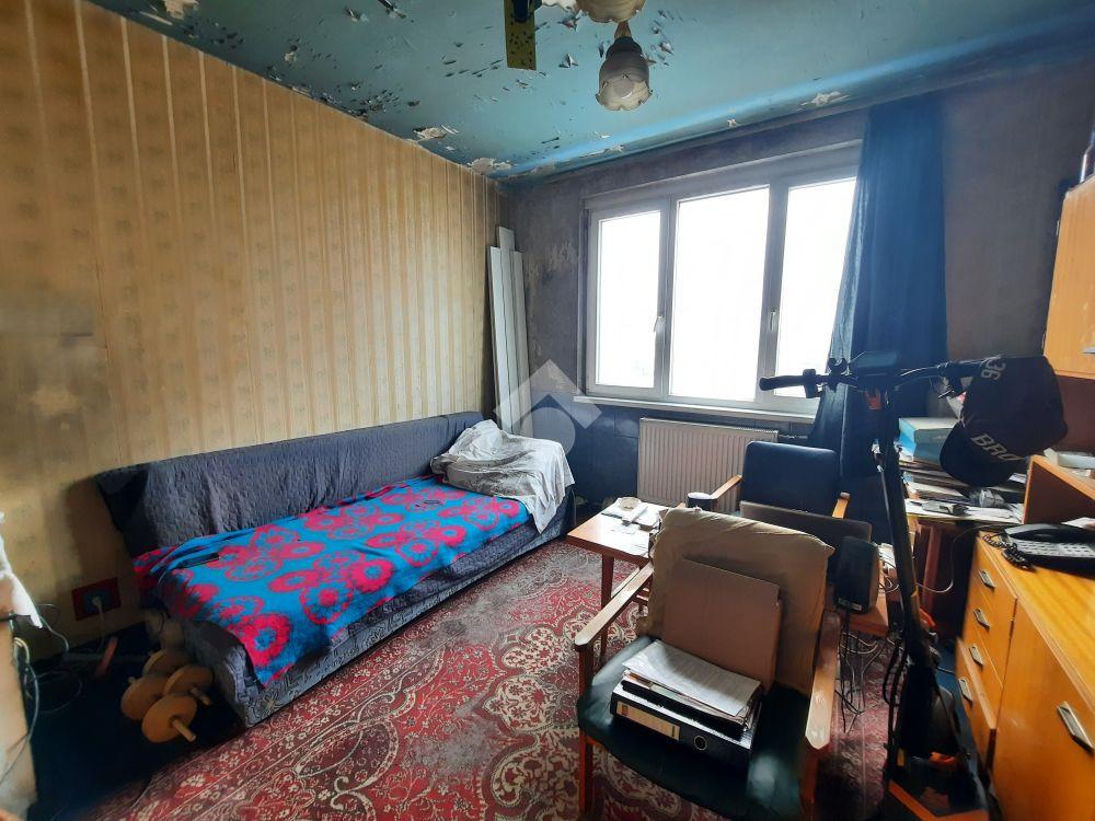 A kisebbik szoba padlószőnyeggel és régi tapétával burkolt, felújítandó, a nagyobbik szobában laminált parketta van, de a tapéta ott is még az régebbi.