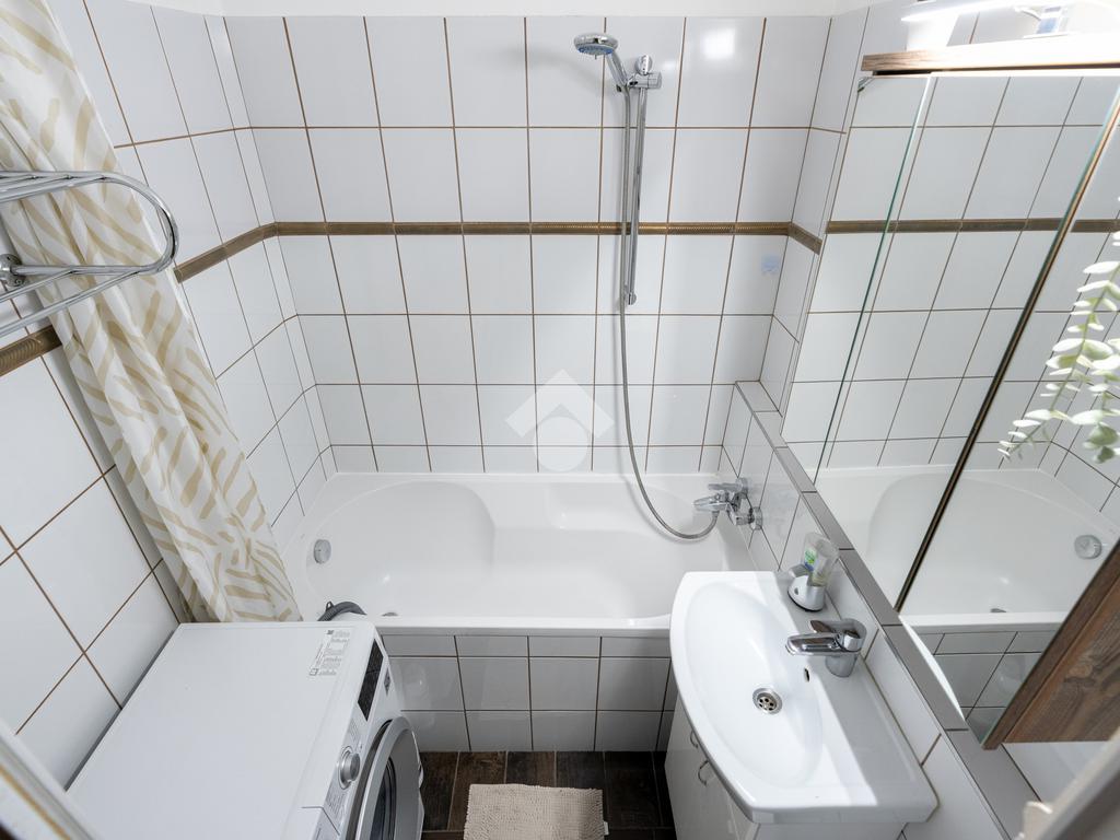 A közlekedő és a konyha járólappal burkolt, a szobák laminált fürdőszoba szép állapotú, kádas kialakítású, a WC külön helyiségben található a két vízórával együtt.